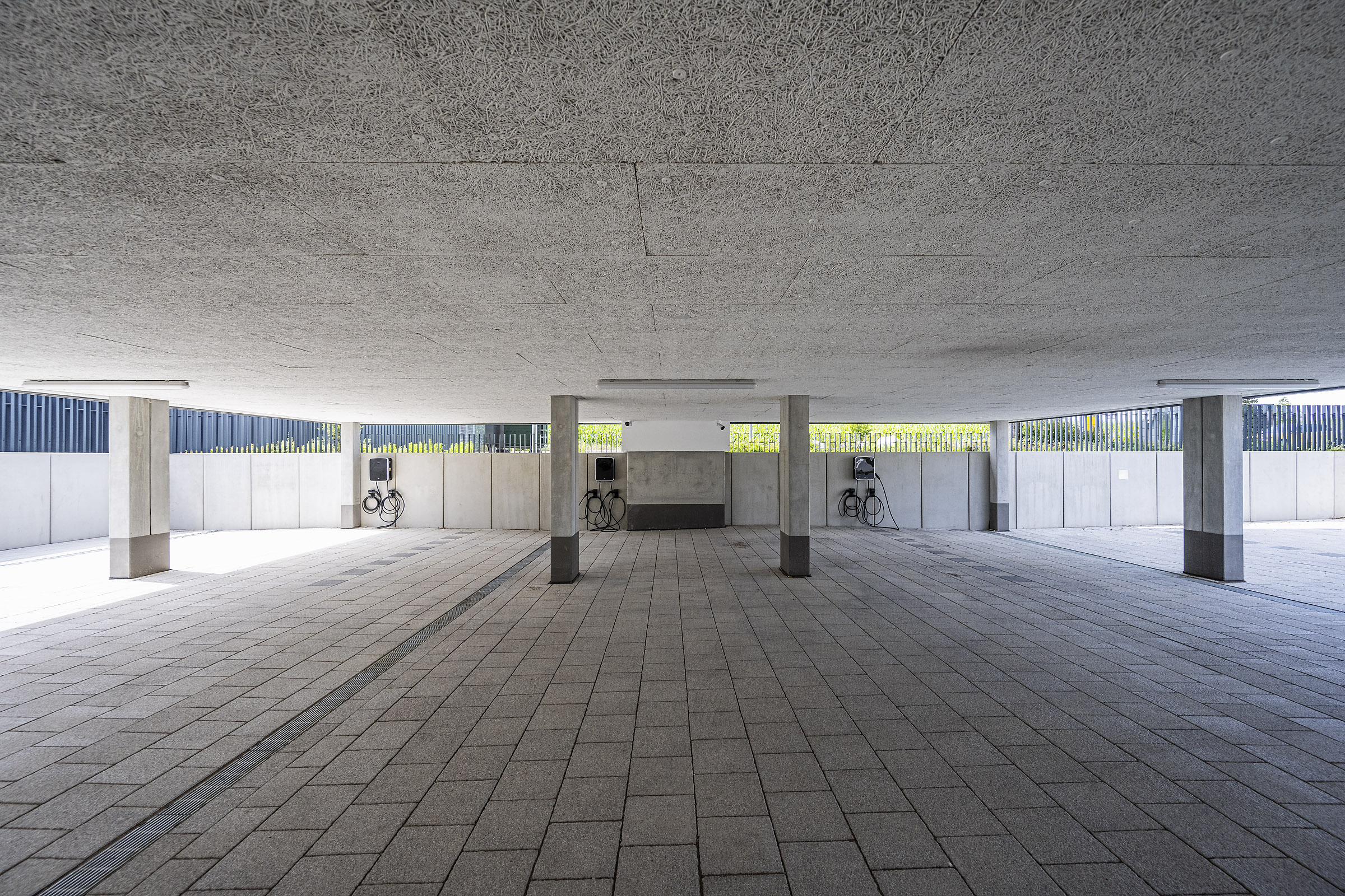 Um das vorhandene Baufeld optimal zu nutzen, wurde das Gebäude um ca. einen Meter über das bestehende Gelände angehoben und auf Stelzen gestellt, um unter dem Gebäude noch ausreichend Platz für 16 Stellplätze zu schaffen.