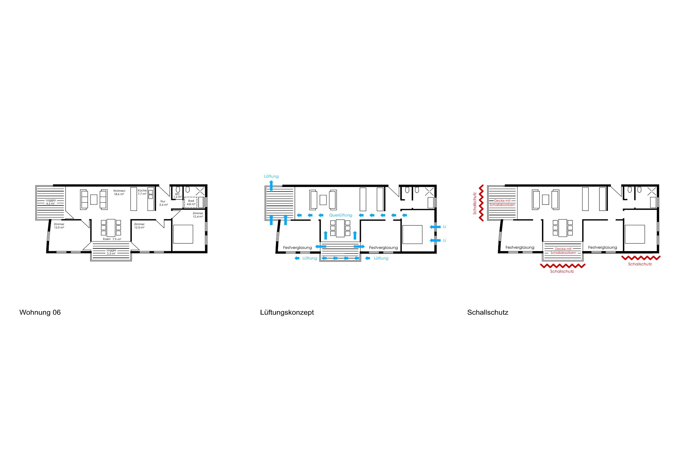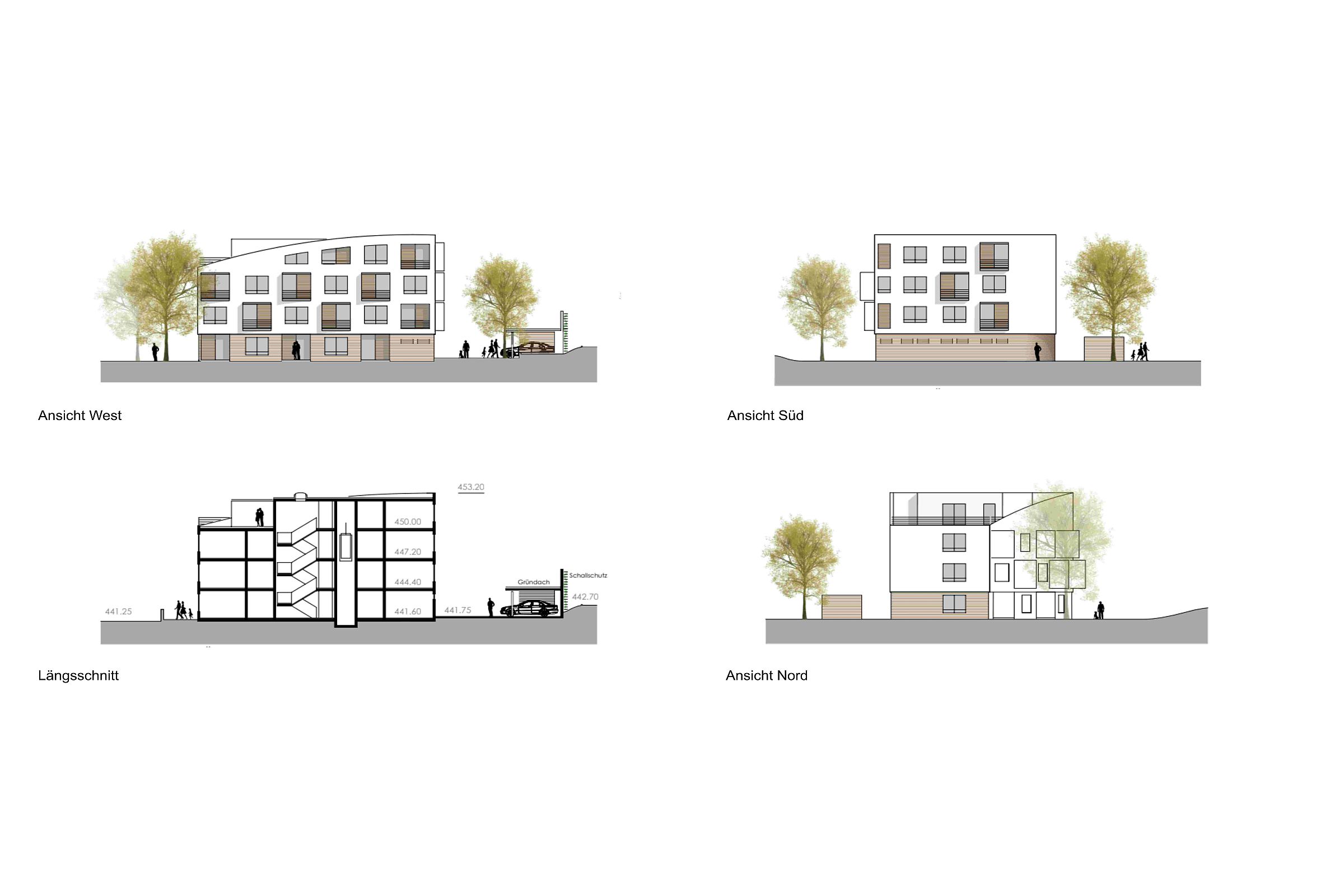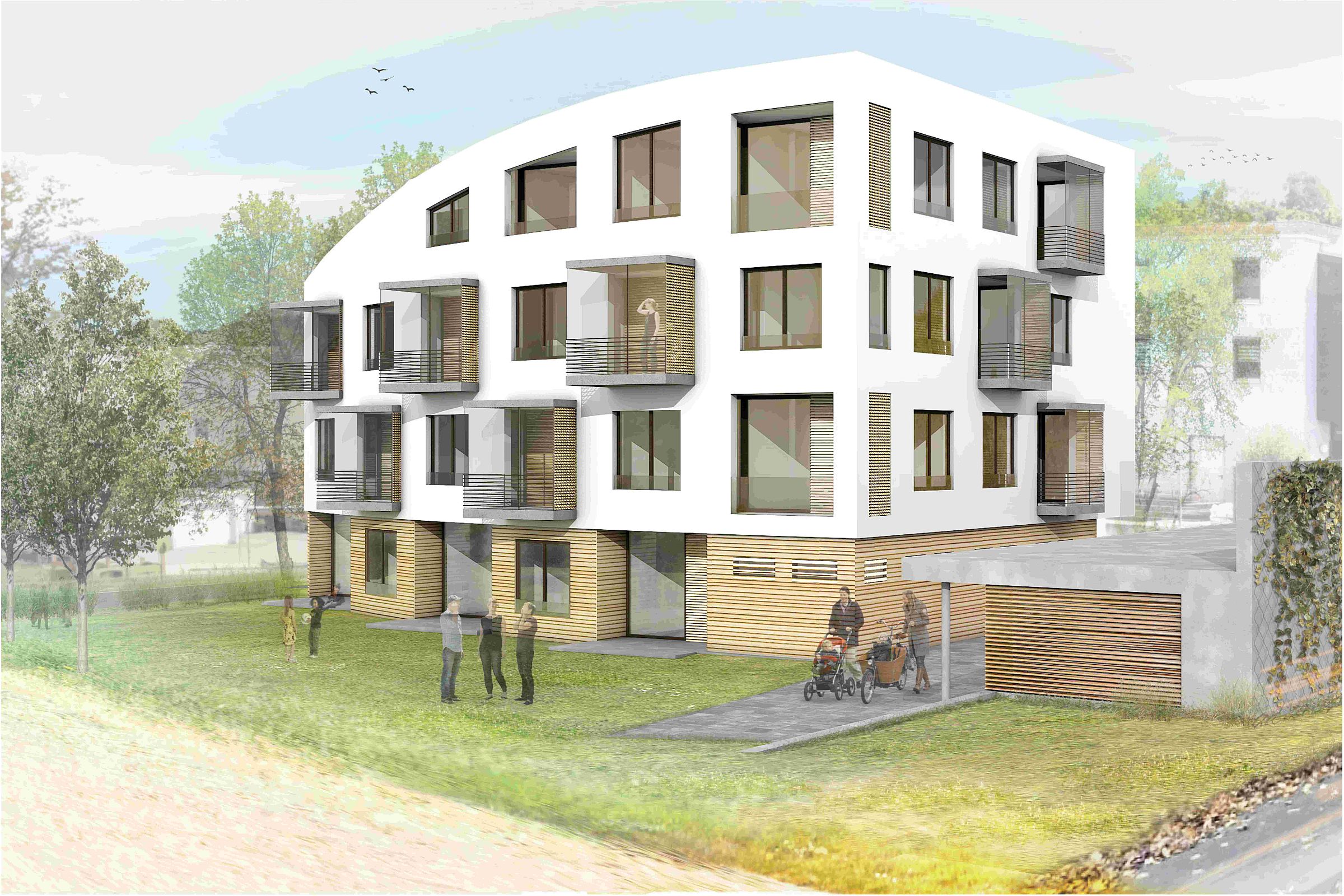 Der Grundriss ist so weit optimiert, dass alle Wohnungen Loggien nach Westen erhalten, die der geschwungenen Form der Fassade zwar folgen, aber deutlich kontrastierende Akzente setzen. Die Materialien der Außenhaut, heller Putz und warmtöniges Holz, unterstützen das gestalterische Gesamtbild. Aufgrund der Schallschutzanforderungen wird ein Massivbau bevorzugt.