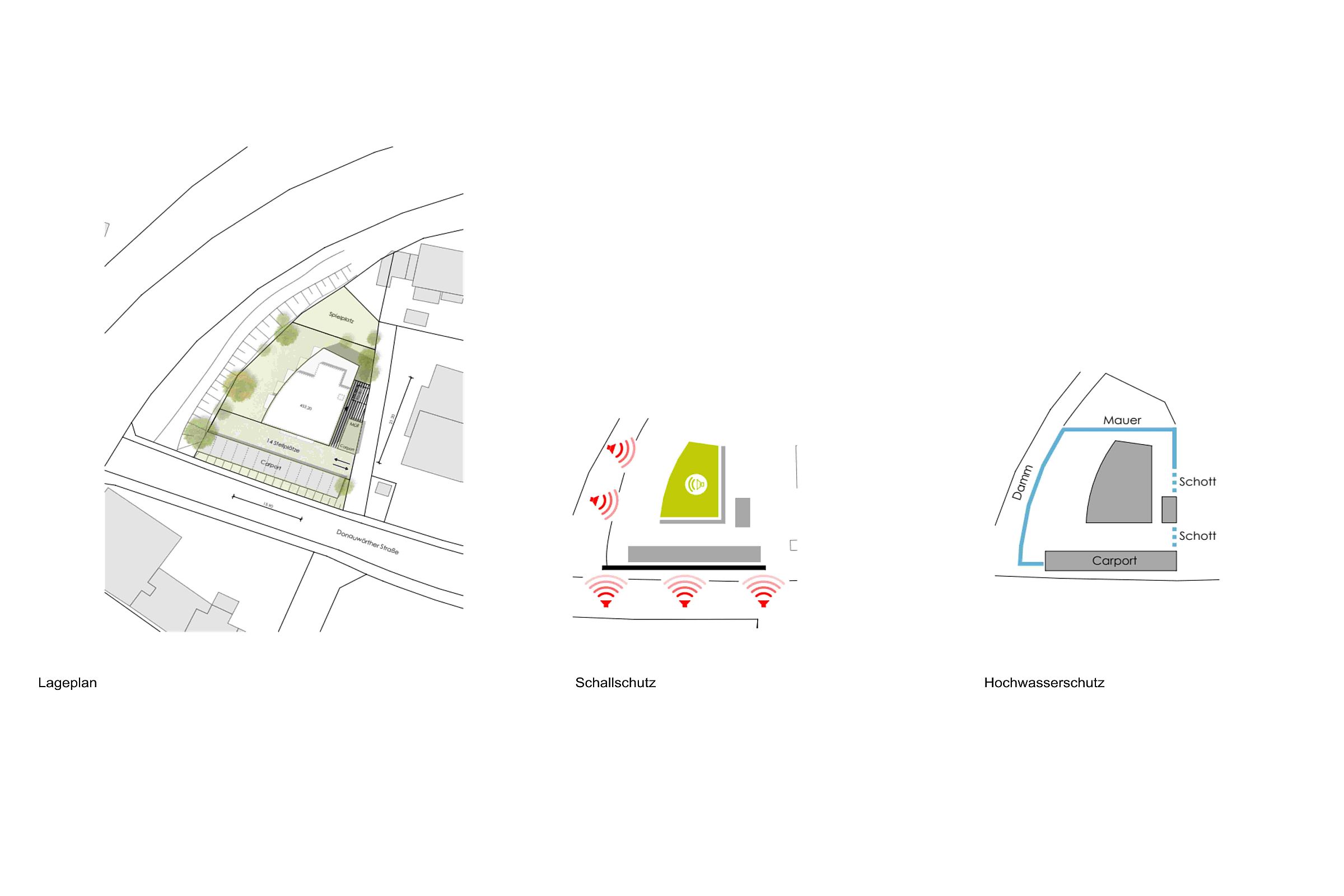 Damm und Carport gewährleisten einen natürlichen Hochwasserschutz. Eine Mauer in entsprechender Höhe schließt die beiden verbleibenden Seiten. Mobile Schotts können bei Bedarf im Bereich des Zugangs und der Zufahrt eingesetzt werden