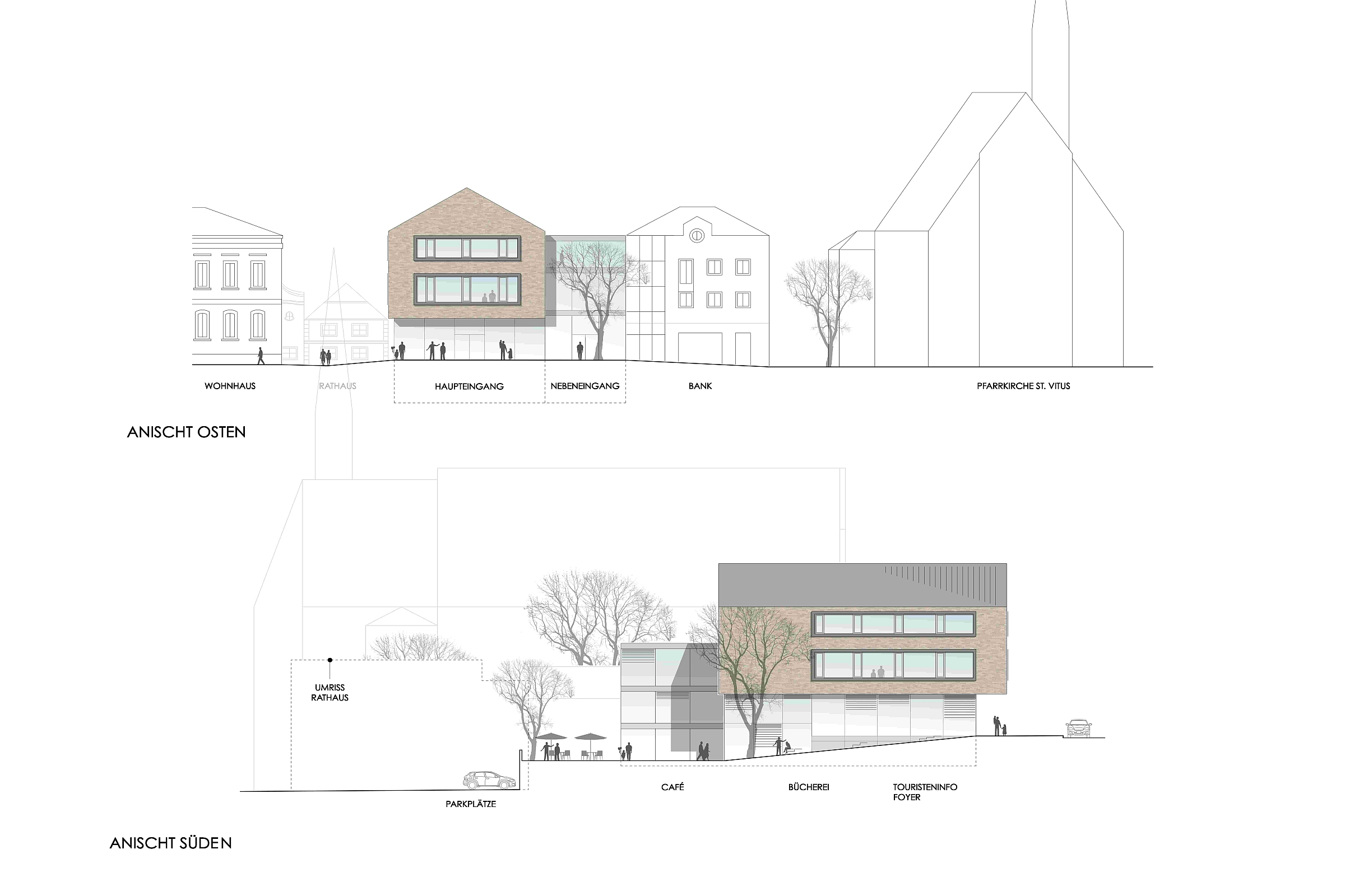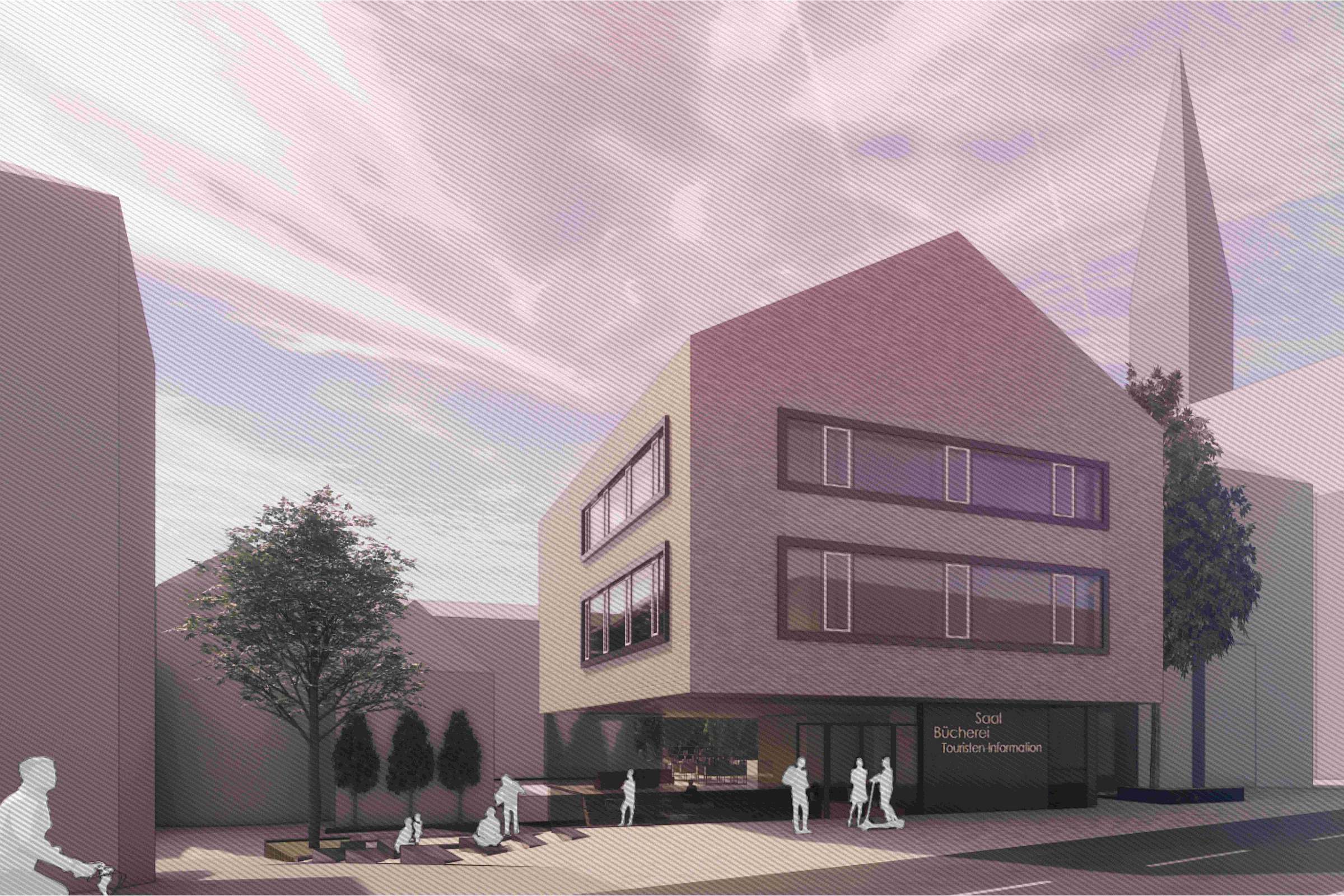 Die Gestaltung des Kultur- und Bürgerzentrums fokussiert sich auf ein modern-minimalistisches Konzept mit hohem Wiedererkennungswert. Die giebelständige Bauweise steht im städtebaulichen Kontext zum Rathaus und der naheliegenden Kirche und wird mit dem markant ausgebildeten Hauptbaukörper als Gebäude der öffentlichen Begegnung klar erkennbar. Die Klinkerfassade, als Blickfang, verstärkt diesen Eindruck und verleiht dem Gebäude eine robuste, aber zugleich elegante Erscheinung.