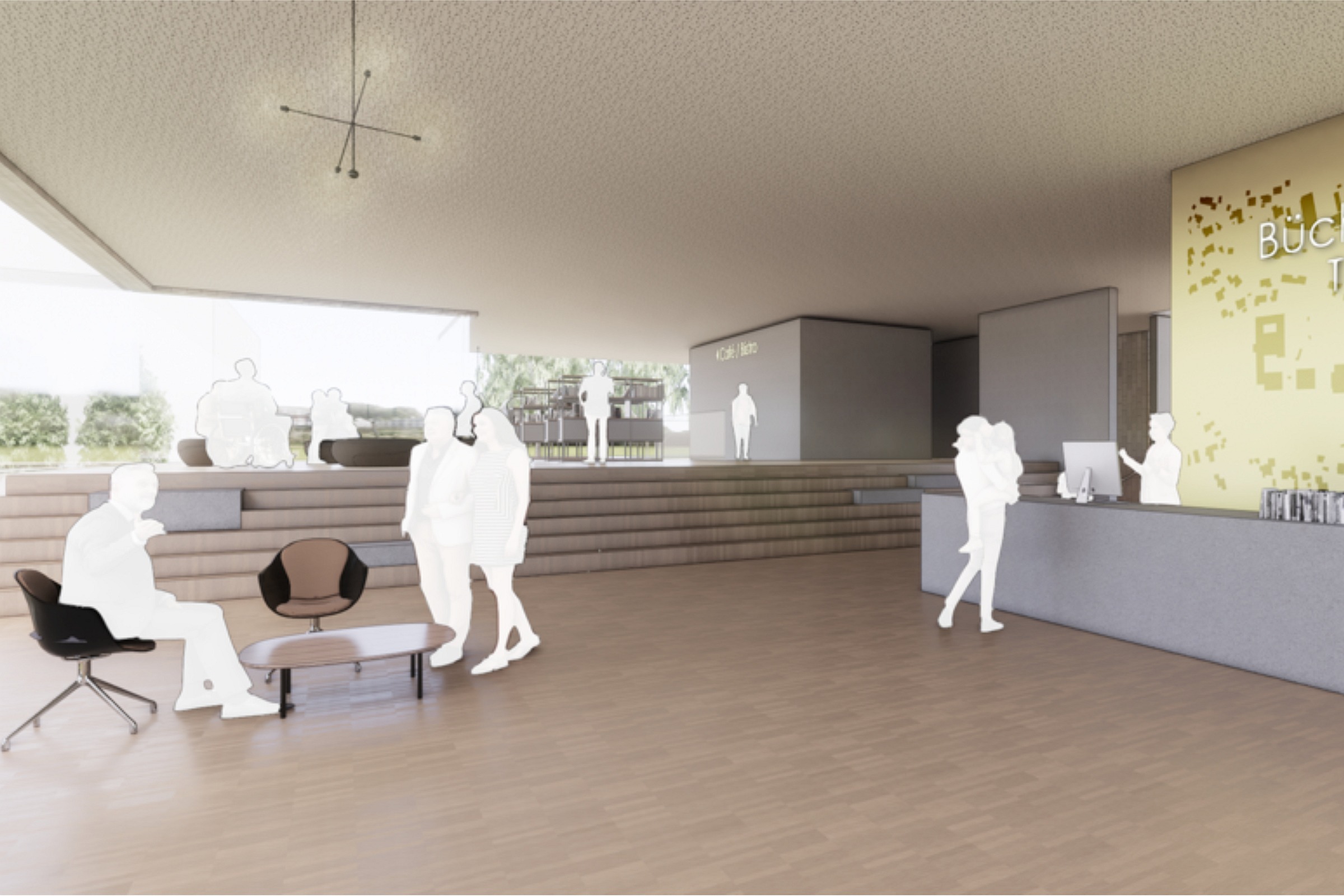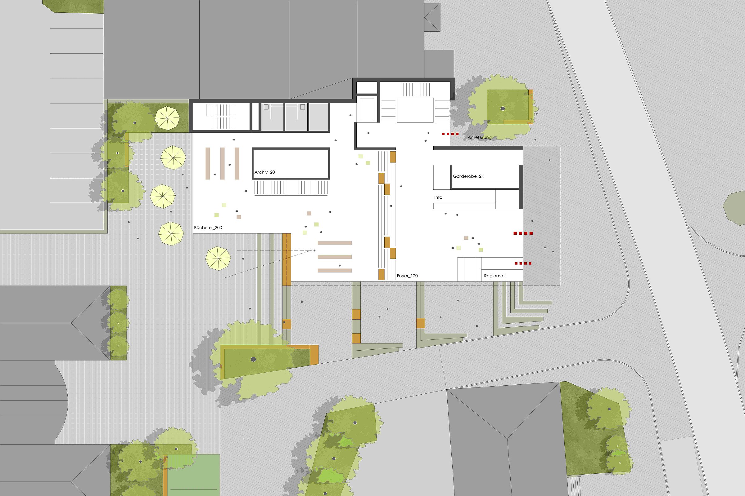 Im Inneren führt die zentrale Eingangshalle zu einem Café, das lokale Produkte serviert, einer Bibliothek, mehreren Büros und einer Mehrzweckhalle. Im Außenbereich vor dem Rathaus entsteht ein zentraler Platz, der die Besucher auf den Sitzstufen entlang des Gebäudes und dem Außenbereich des Cafés zum Verweilen einlädt.