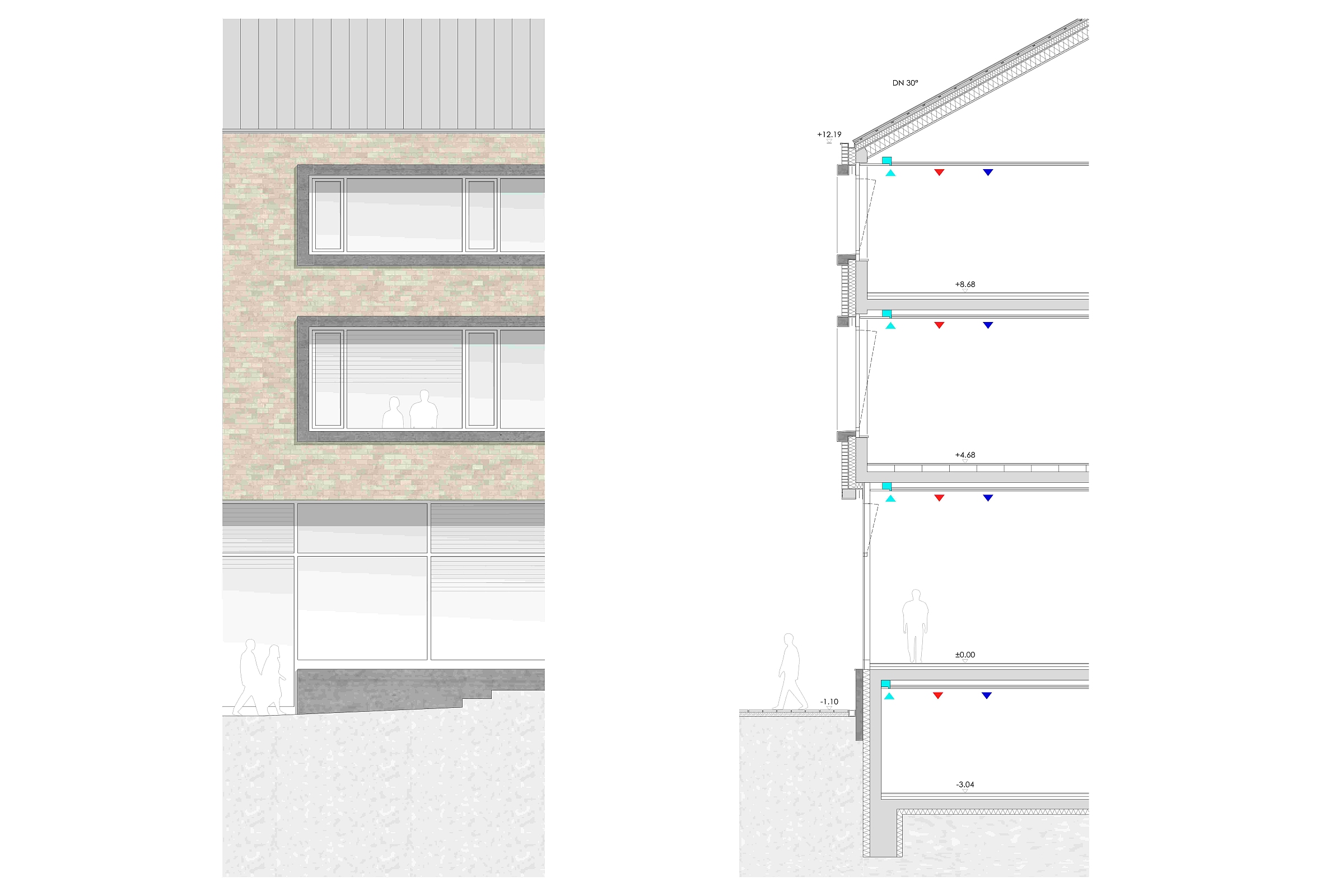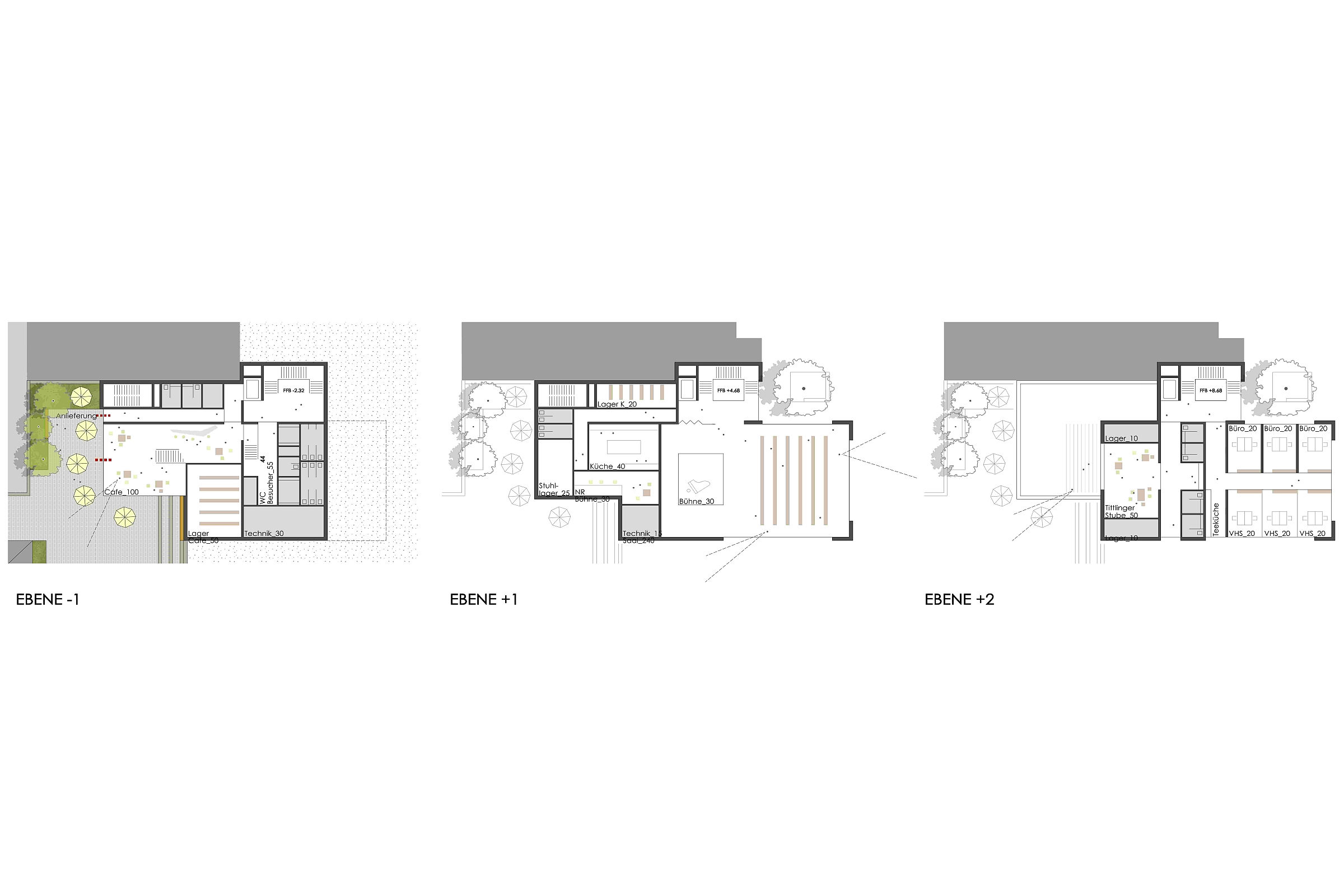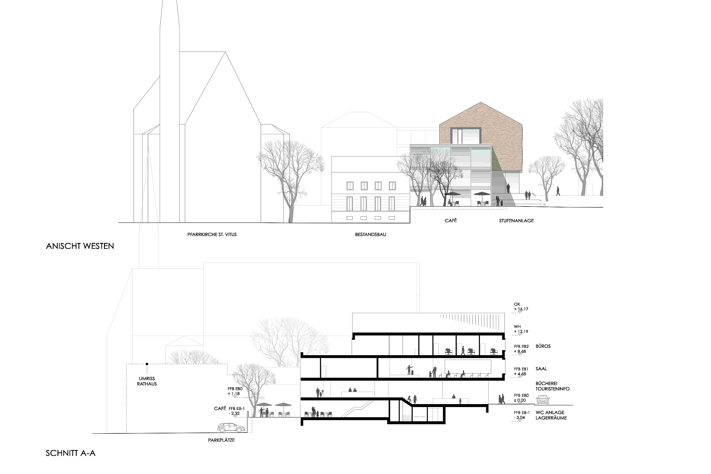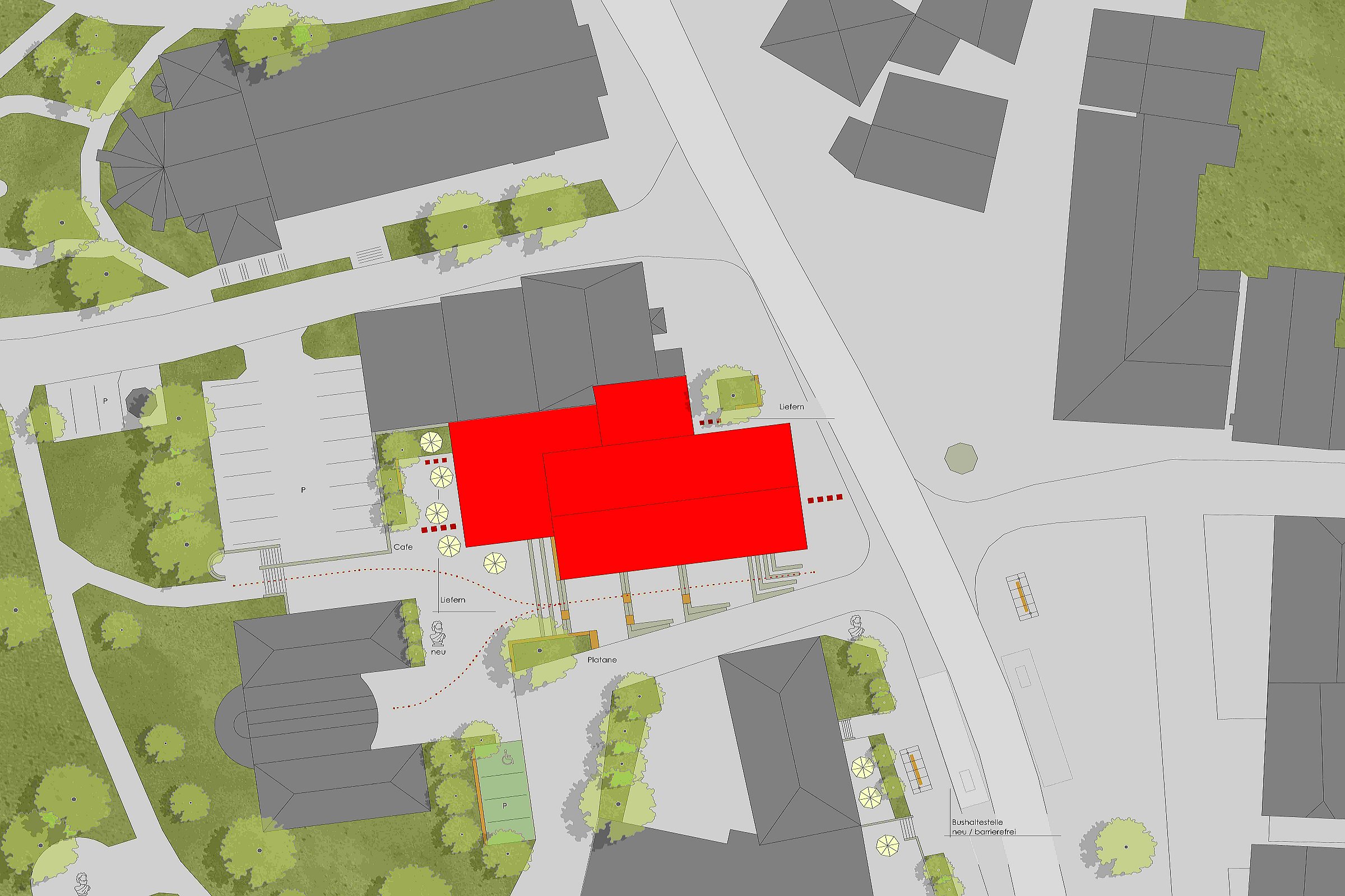 Die Flächeninanspruchnahme ist durch die kompakte Bauweise auf ein Minimum reduziert. Der Abbruch des rückwärtigen Gebäudes erfolgt zugunsten der Flächenentsiegelung und wird durch die Rückführung der Baumaterialien in den zirkulären Bauprozess kompensiert. Angestrebt ist eine Mindestqualität als Energieeffizienzhaus 55.